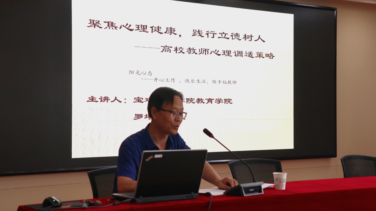 根据学校本年度教师素养提升计划,为促进我校教师的心理健康,以阳光的心态管理情绪应对压力,开心工作,快乐生活,做幸福教师,教师发展中心于6月23日下午,邀请宝鸡文理学院教育科学研究所副所长、陕西省心理学会理事、宝鸡市心理学会会长罗增让教授在宝福路校区汽车机电大楼会议室为全体教职工作题为《聚焦心理健康践行立德树人----高校教师心理健康调适策略》的心理健康知识讲座。